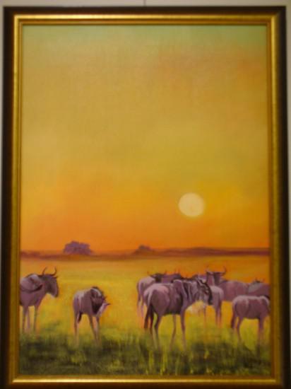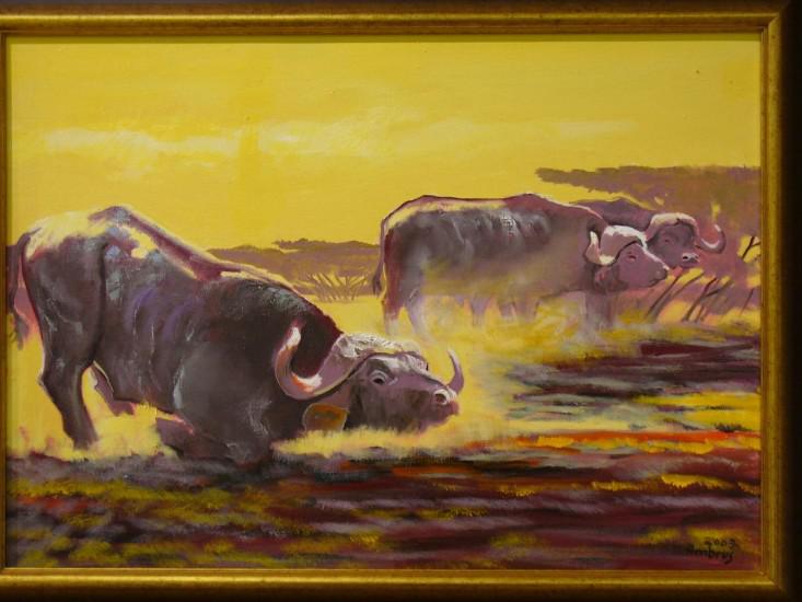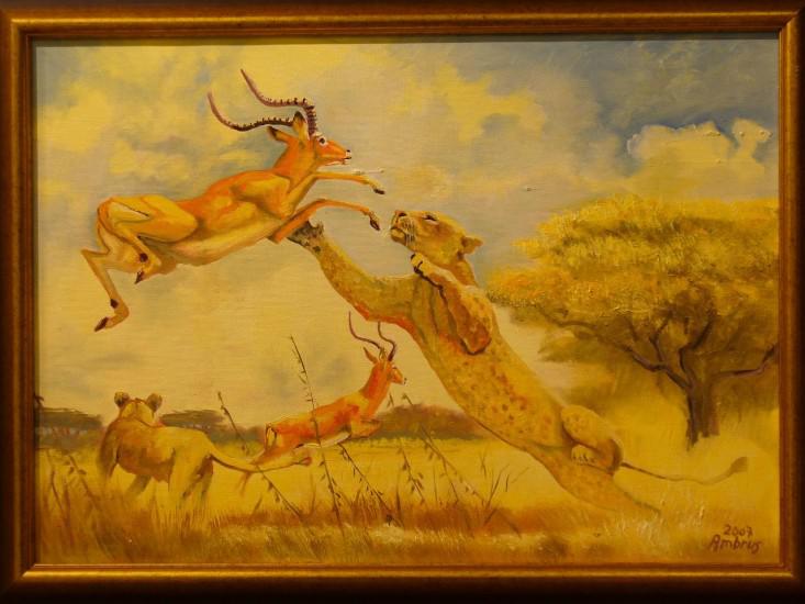 Muray Róberttel való találkozása meghatározó volt, s tagja lett az 1994-ben alakult Altamira Egyesületnek, ahol is a kör tagjainak segítségével munkássága teljesebbé vált. Szerencséje úgy hozta, hogy 98-ban kijutott Namíbiába vadászni, ottani élményeit jellegzetes afrikai képekben jeleníti meg. Ambrus Lajosnak a látvány a fontos, egy szép táj egy mozgalmas nap feledteti az elmaradt fegyverhasználatot. A képek fotók módjára rögzülnek emlékezetében, ezekből születnek a későbbi művek. Falujának polgármestereként elismert ember, tíz éve vezet a fiataloknak szakkört, s megalapította a Ballószögi Művésztelepet, ahol rendszeresen megfordulnak neves alkotók is. Talán elmondható róla, hogy boldog ember, hozzájárul az élet szebbé tételéhez és tovább viszi, adja amit tanítóitól, őseitől kapott.